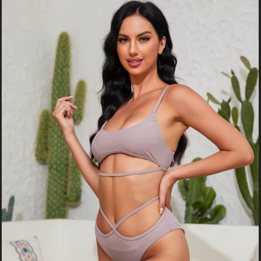 Swimsuit set manufacturer solid color breathable knitted fabric non-wired swimsuit and woven bra briefs set